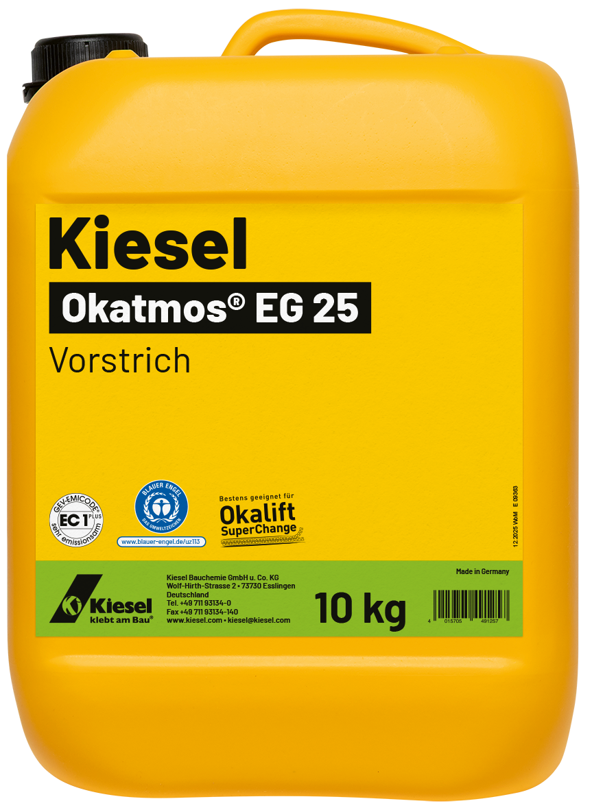 Okatmos® EG 25 mit Lammfellrolle oder Bürste auf den Untergrund auftragen. Pfützen und Schichtbildung vermeiden. Auf Zement- oder Calciumsulfatestrichen Okatmos® EG 25 je nach Saugfähigkeit im Verhältnis 1:1 bis 1:3 mit Wasser verdünnen. Auf dichten, nicht saugfähigen Untergründen sowie Holzuntergründen Okatmos® EG 25 unverdünnt verwenden. Erst nach vollständiger Trocknung mit Spachtelarbeiten beginnen.