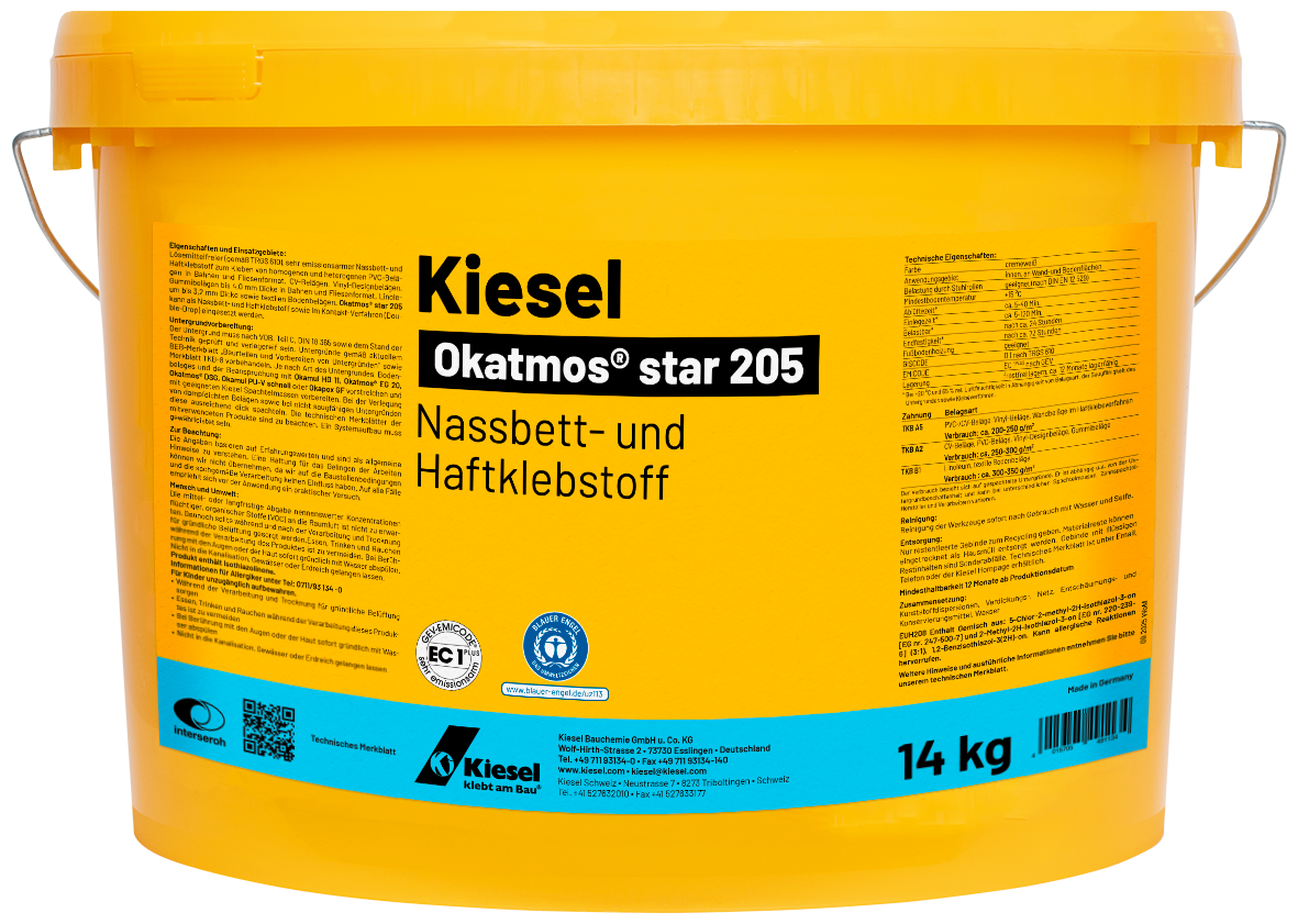 Lösemittelfreier (gemäß TRGS 610), sehr emissionsarmer Nassbett- und Haftklebstoff zum Kleben von homogenen und heterogenen PVC-Belägen in Bahnen und Fliesenformat, CV-Belägen, Vinyl-Designbelägen, Gummibelägen bis 4,0 mm Dicke in Bahnen und Fliesenformat, Linoleum bis 3,2 mm Dicke sowie textilen Bodenbelägen. Okatmos® star 205 kann als Nassbett- und Haftklebstoff sowie im Kontakt-Verfahren (Double-Drop) eingesetzt werden.